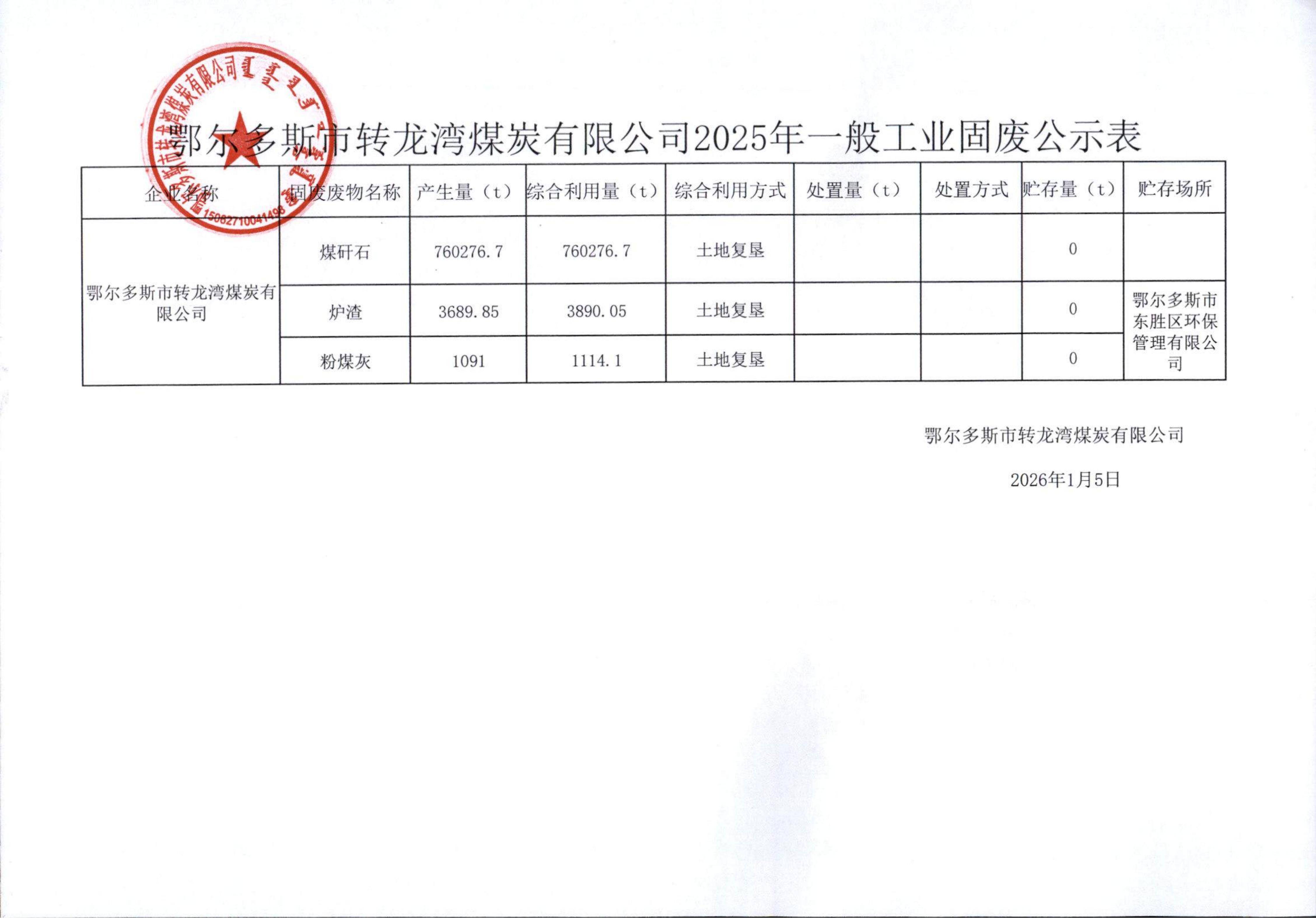 鄂尔多斯市转龙湾煤炭有限公司2025年一般工业固废信息公开统计表