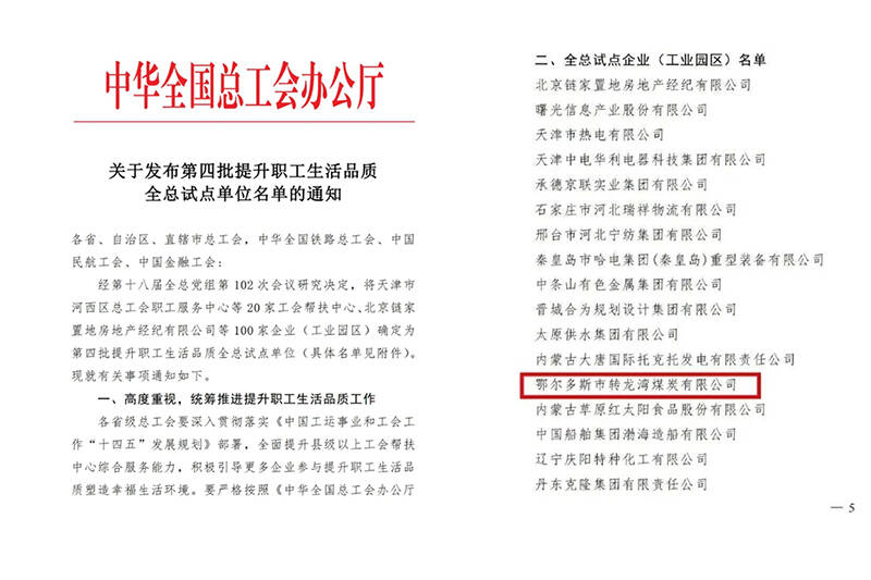 近日,从伊金霍洛旗总工会获悉,转龙湾煤矿成功入选“第四批提升职工生活品质全国总工会试点单位”,实现“省级-国家级”荣誉的稳步进阶。
